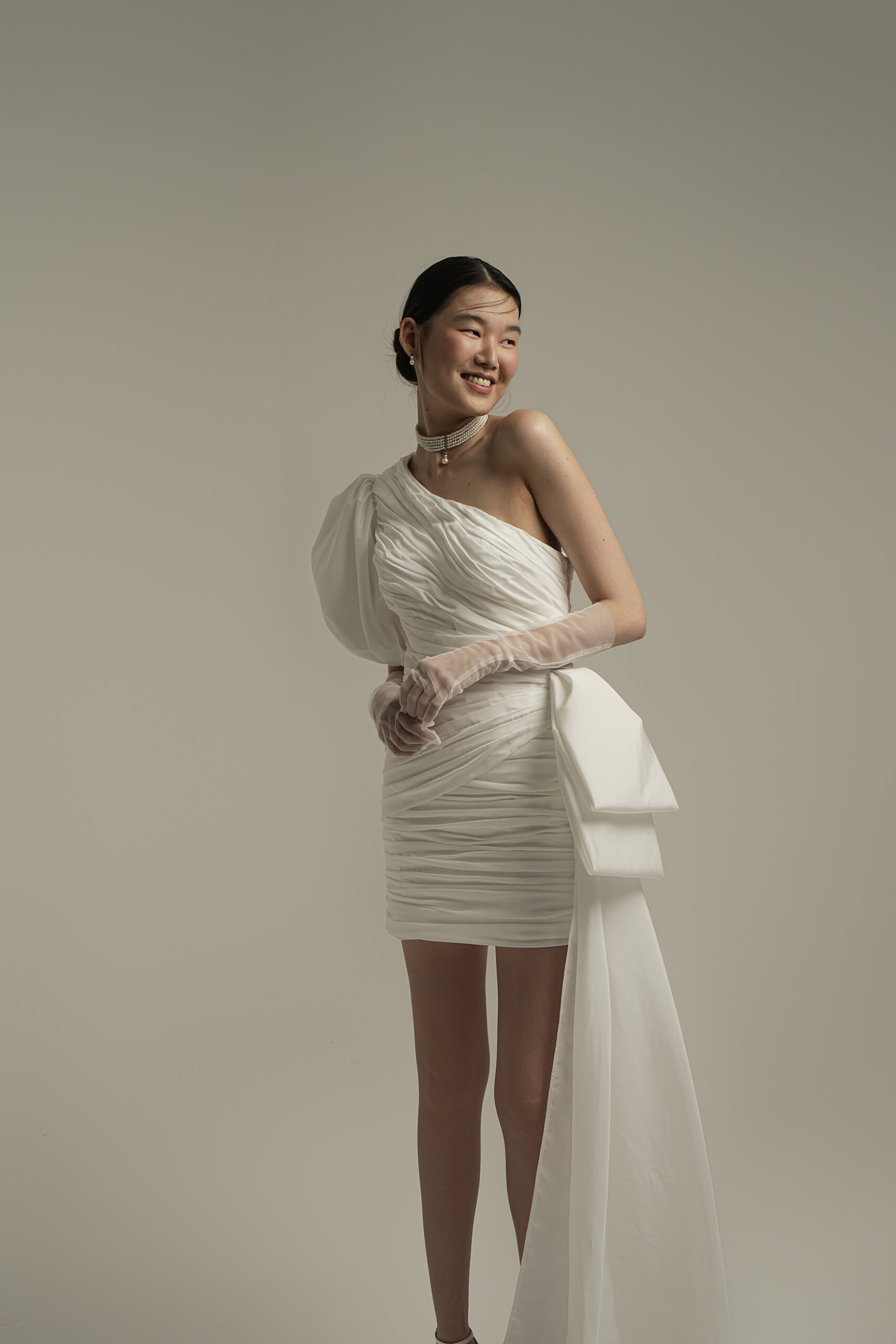 Mini dress with taffeta draping, asymmetry sleeves and collar.