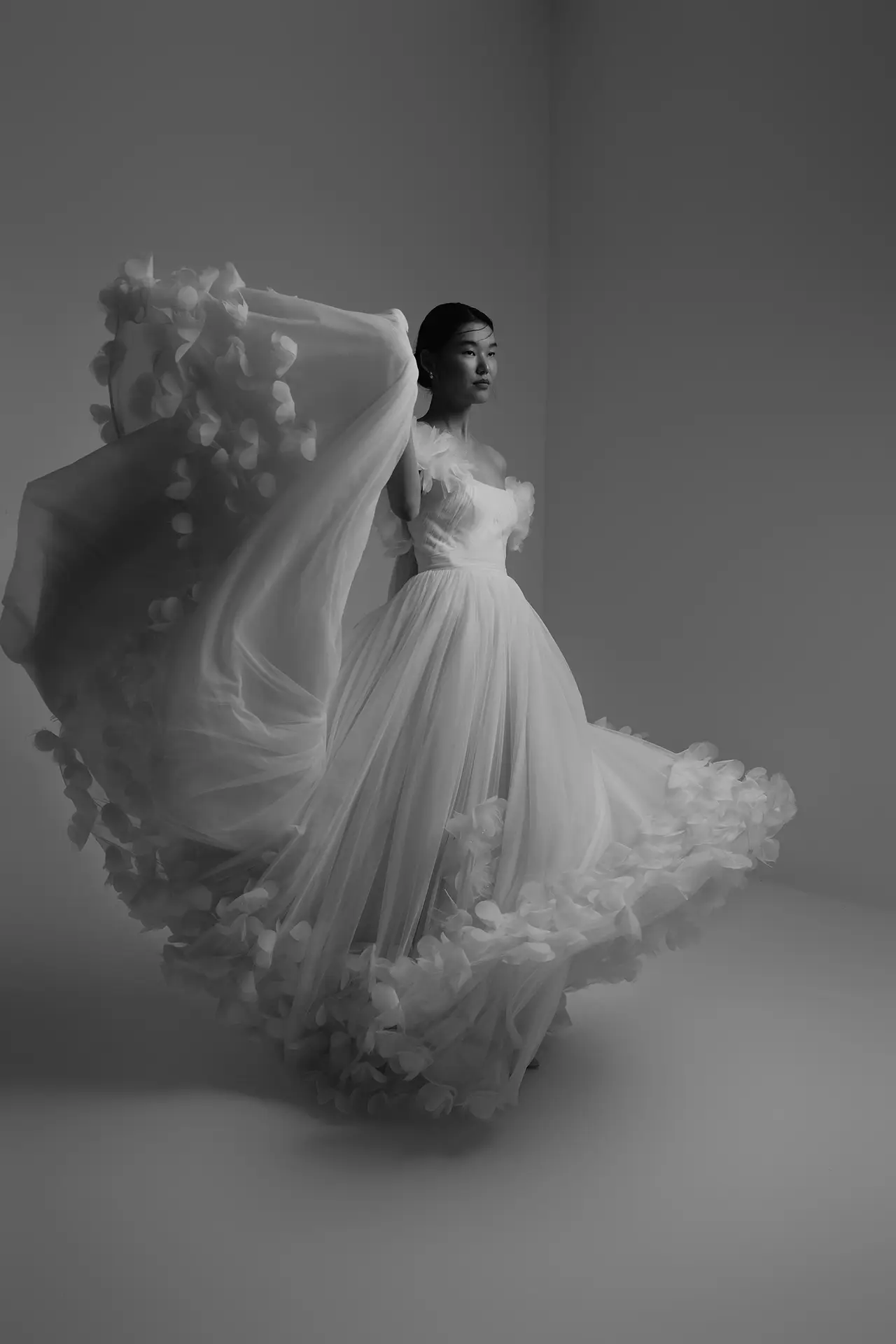 Silk tulle draped wedding dress with