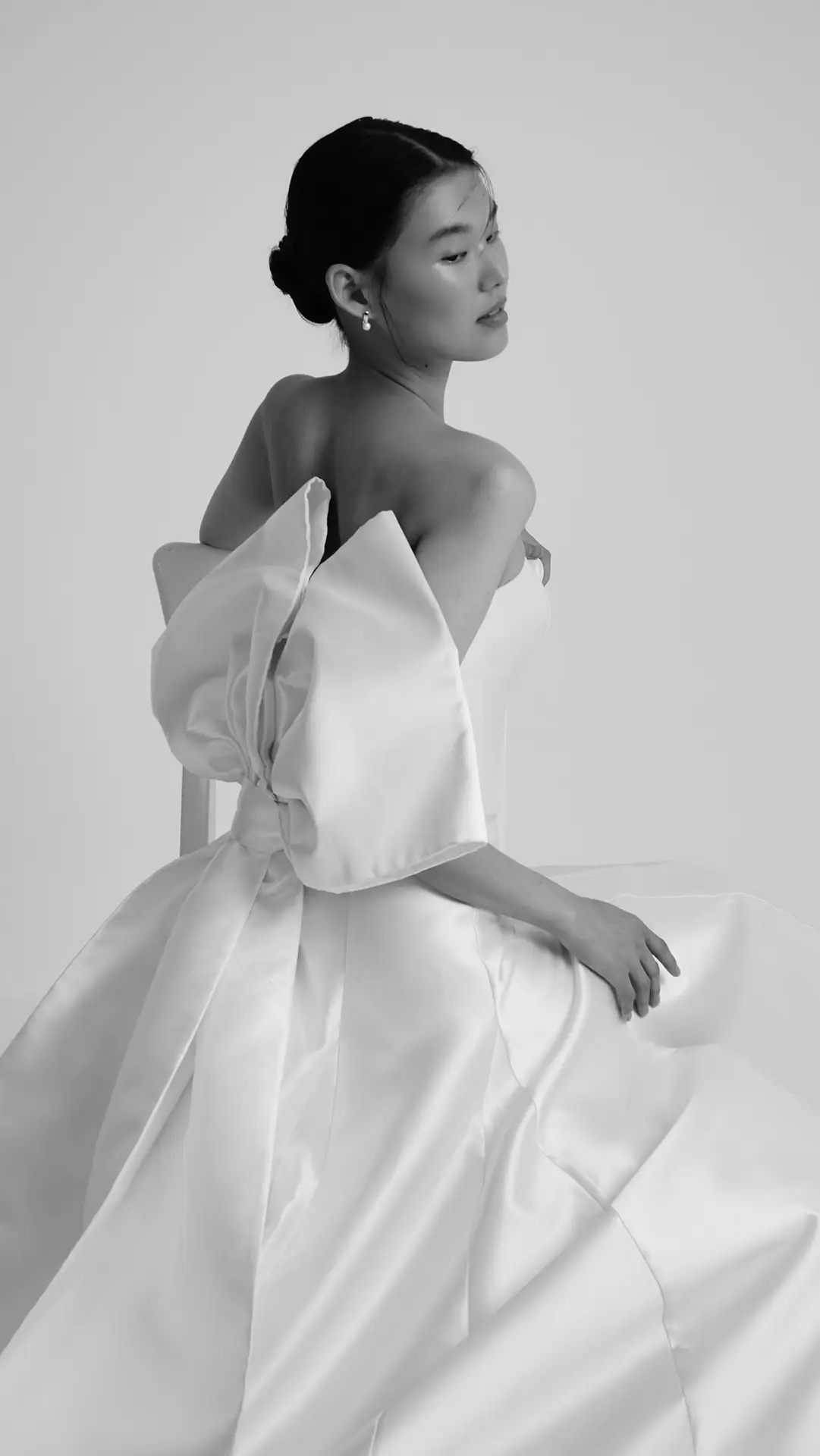 A-line wedding dress that hugs the hips slightly. Detachable bow at the back.