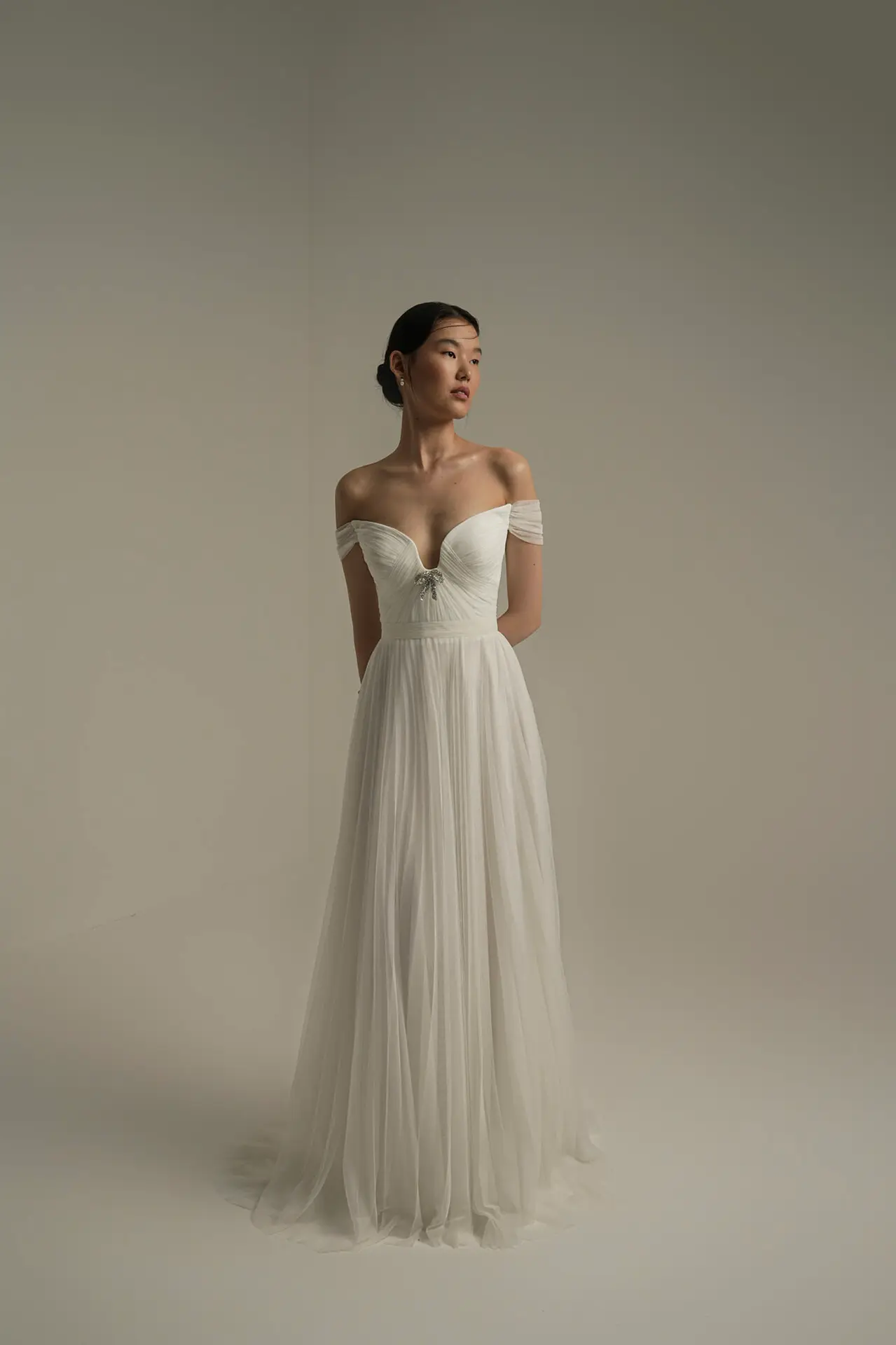 Swarovski bow in the middle of the neckline. Flowy tulle skirt.