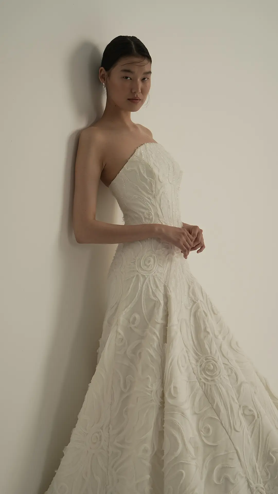 A-cut custom made silk chiffon patterned wedding dress with a slightly fitted skirt.