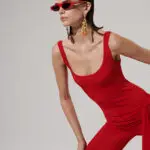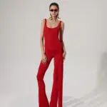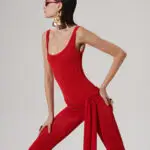 Fine stretchy knit fabric, red square collar jumpsuit
