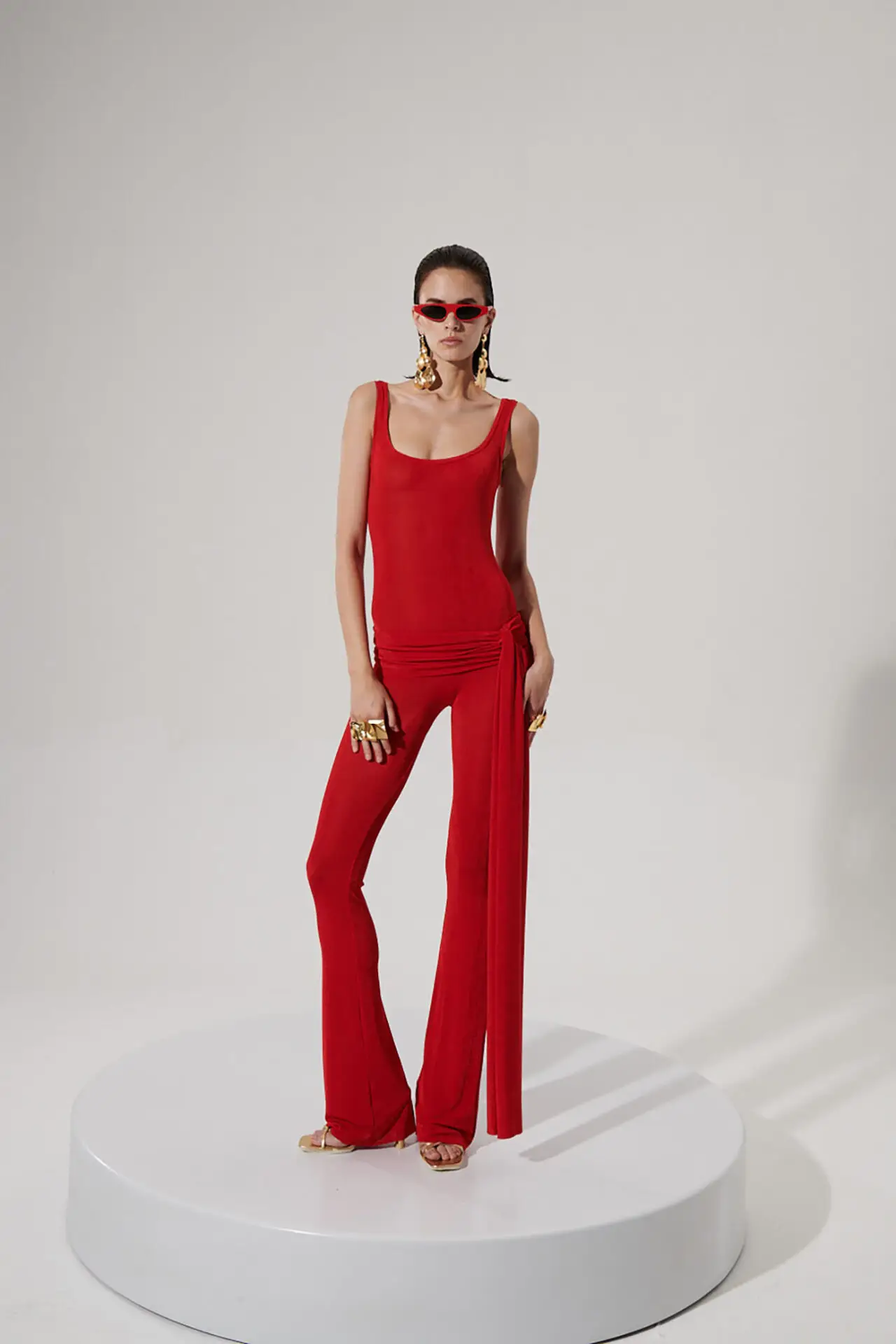 Fine stretchy knit fabric, red square collar jumpsuit