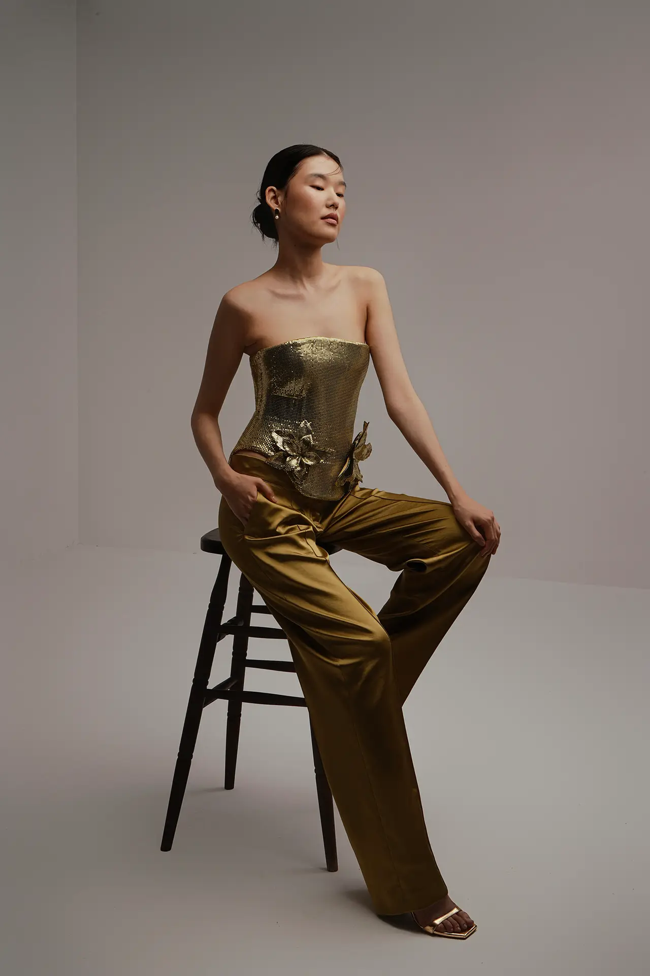 Bustier with small square stones in gold color and a daisy pattern on it, and pure silk trousers