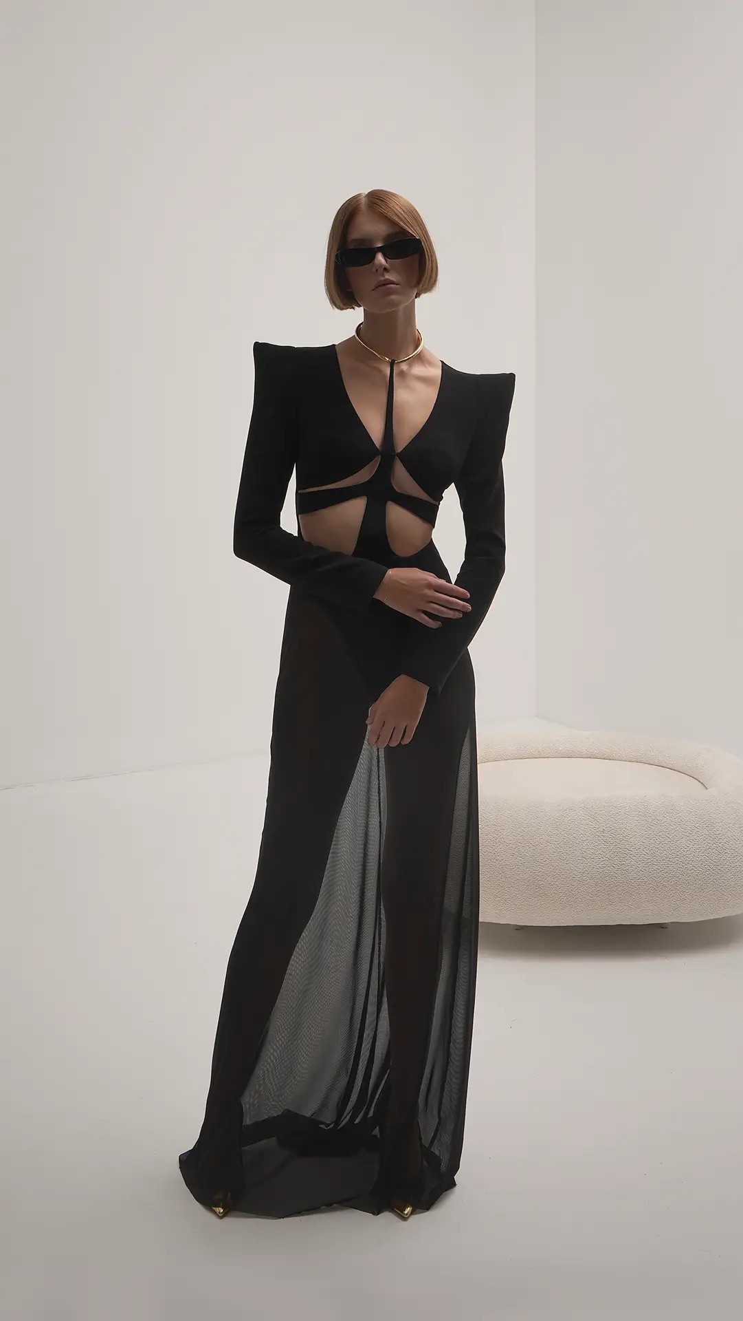Cut-out cut dress with transparent skirt. Gold metal necklace around the neck.